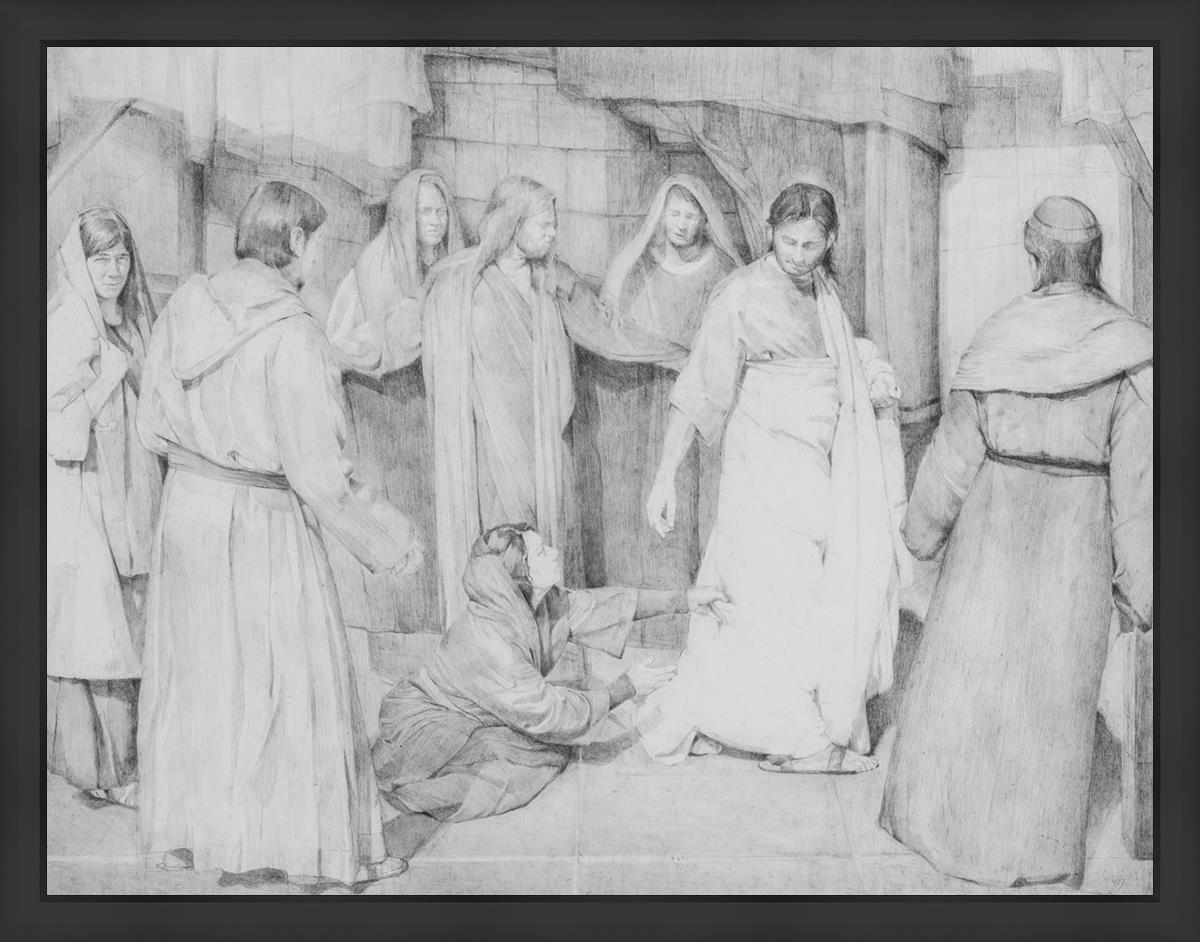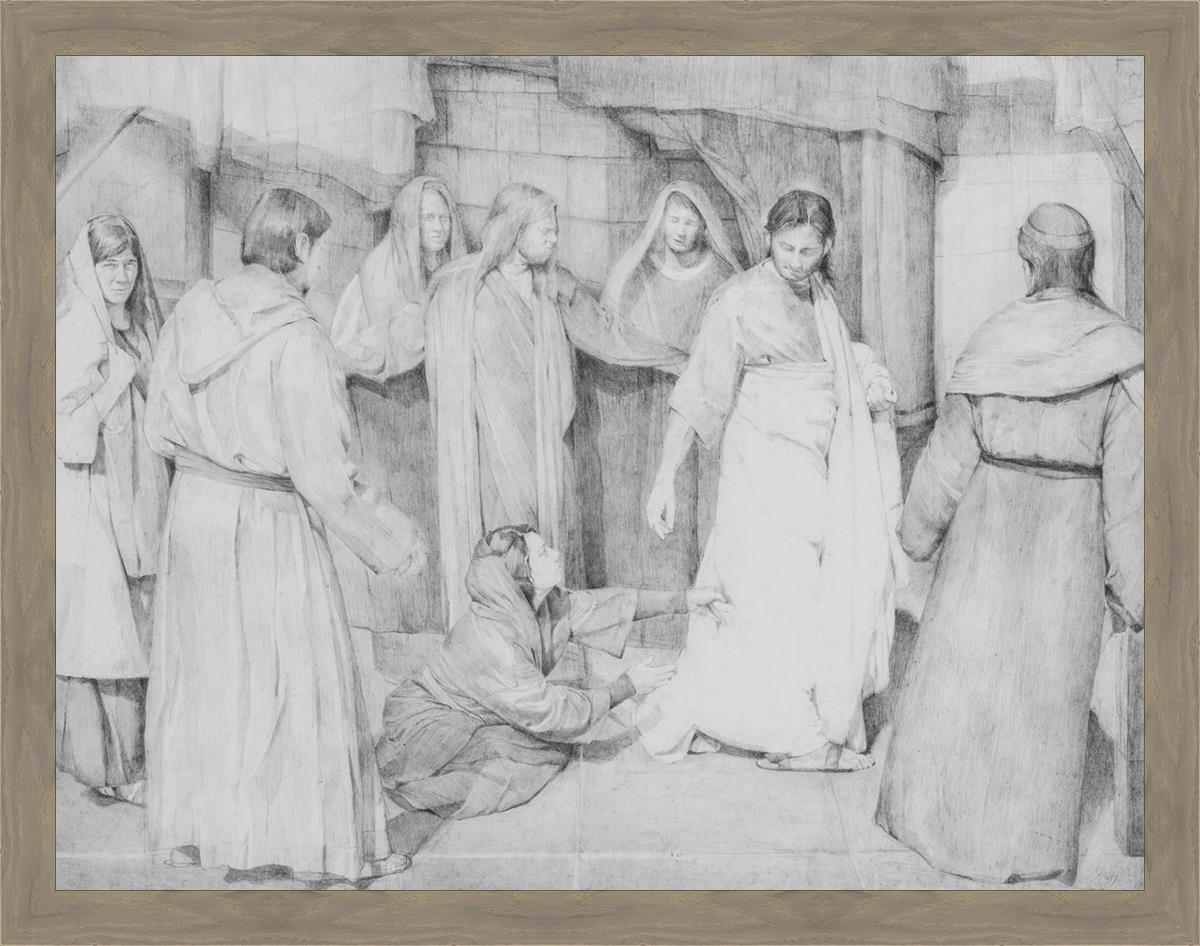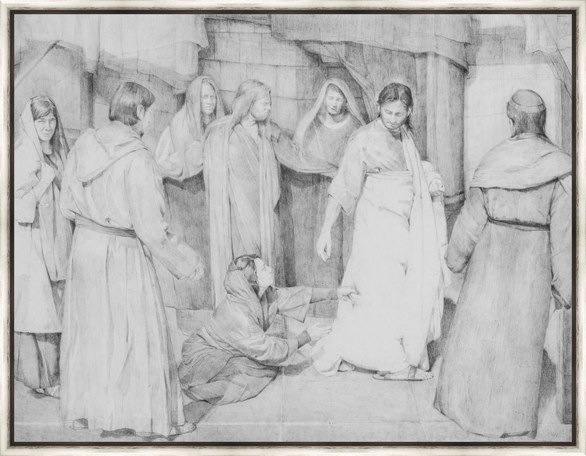 I love the idea of Peter protecting the Savior from the Multitude thronging him and illustrated Peter with his Arms outstretched. I loved the idea that others behind him were wishing to be right there next to the Savior and are peering over Peters protective arms including his Mary Madeline with a joyous gaze at the incident and John the Beloved overlooking Peters Arms with compassion towards this woman.