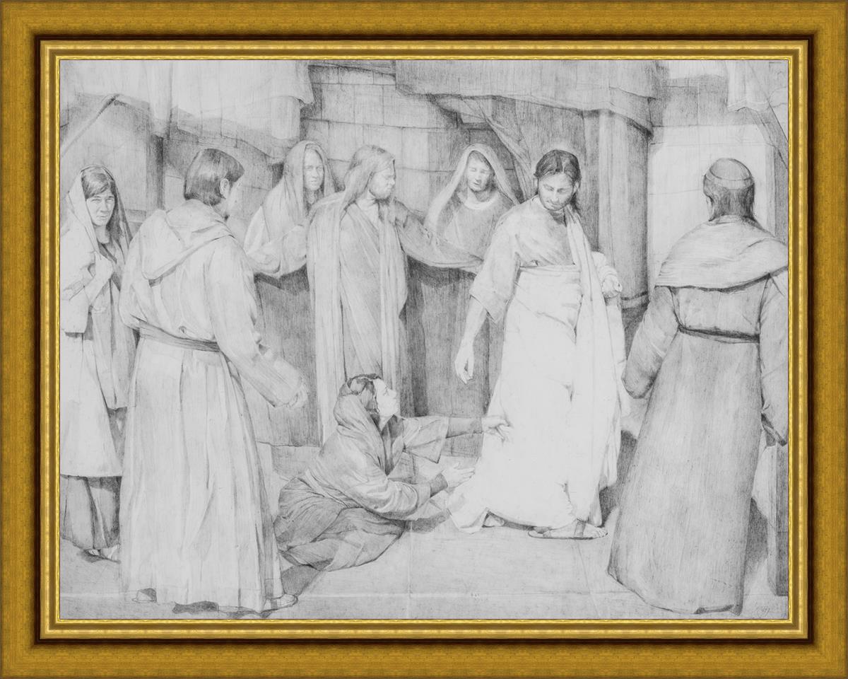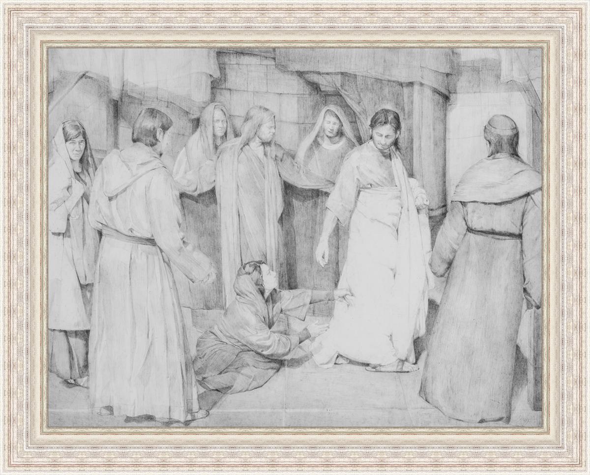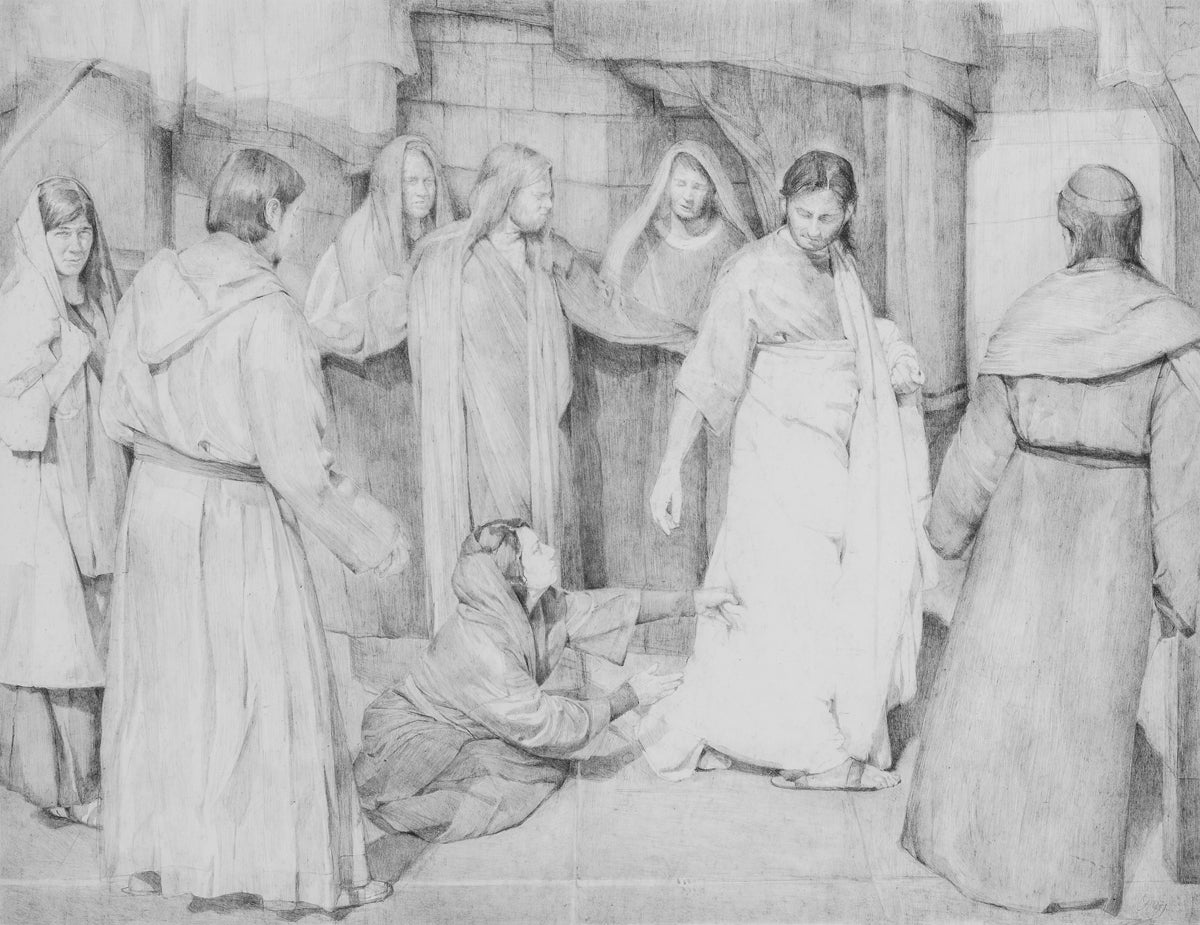 I love the idea of Peter protecting the Savior from the Multitude thronging him and illustrated Peter with his Arms outstretched. I loved the idea that others behind him were wishing to be right there next to the Savior and are peering over Peters protective arms including his Mary Madeline with a joyous gaze at the incident and John the Beloved overlooking Peters Arms with compassion towards this woman.